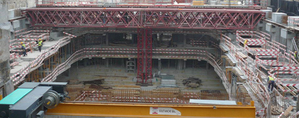 The new theatre in Bordeaux, France, is being built on a site surrounded by existing buildings. We were asked to provide a support system to carry formwork for the construction of a number of 6 ft wide, 7 ft high, 105 ft long in-situ concrete beams. These beams needed to span the stage area and also support a further 5 floors of apartments and office accommodation being built above. The girder systems supplied by us were to vary in length - with the longest being 30.90m - which needed to be lowered, relocated, and in some cases altered in length before work on the next beam could begin.